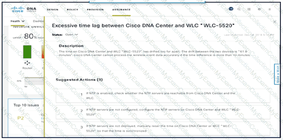 NTP is configured across the network infrastructure and Cisco DNA Center. An NTP issue was reported on the Cisco DNA Center at 17:15. Which action resolves the issue?
