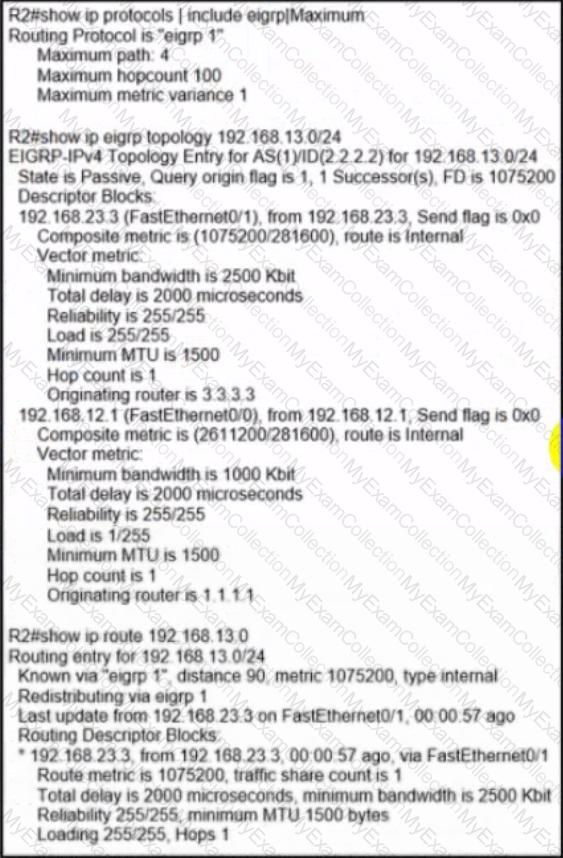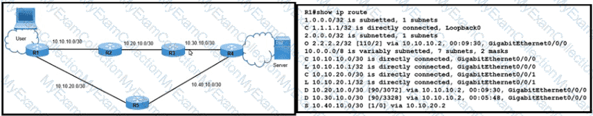 Routers R1, R2, R3, and R4 use EIGRP However, traffic always prefers R1 to R5 backup links in nonfailure scenarios. Which configuration resolves the issue?