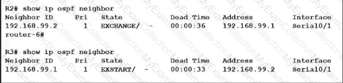 An OSPF neighbor relationship between R2 and R3 is showing stuck in EXCHANGE/EXSTART state. The neighbor is established between R1 and R2. The network engineer can ping from R2 to R3 and vice versa, but the