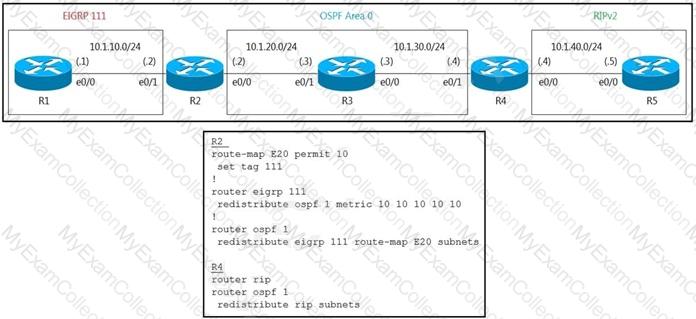 R5 should not receive any routes originated in the EIGRP domain. Which set of configuration changes removes the EIGRP routes from the R5 routing table to fix the issue?