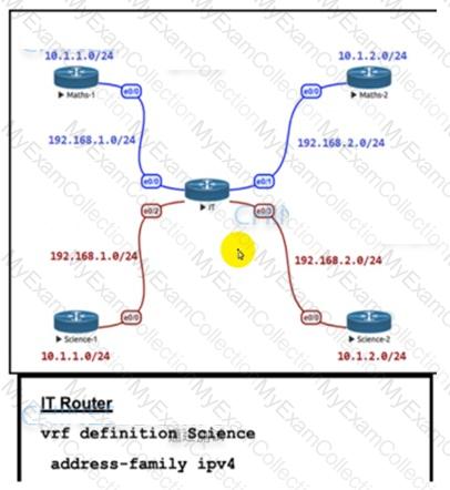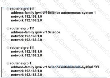 Refer to the exhibit. The IT router has been configured with the Science VRF and the interfaces have been assigned to the VRF. Which set of configurations advertises Science-1 and Science-2 routes using EIGRPAS 111?