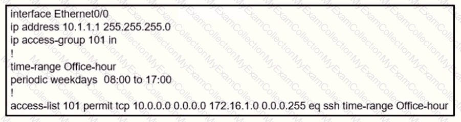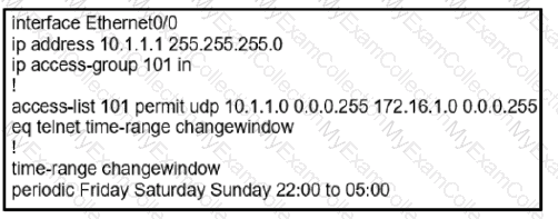 configuration that permits a Telnet connection from the inside network (Eth0/0) to the outside of the networking between Friday – Sunday night hours only. Which configuration resolves the issue?