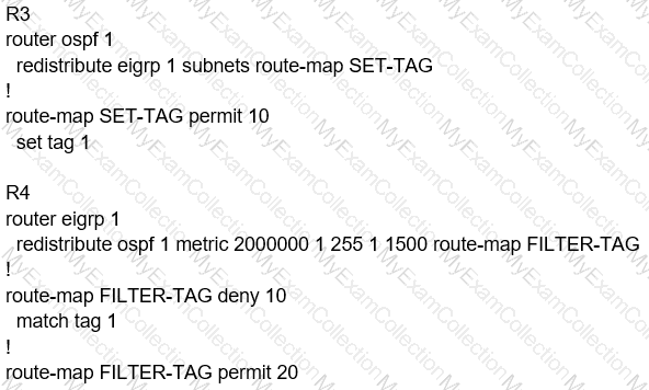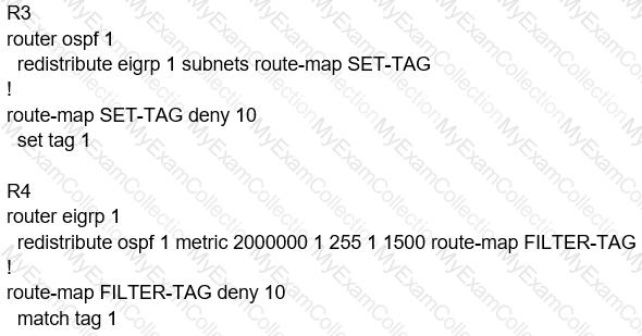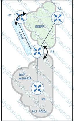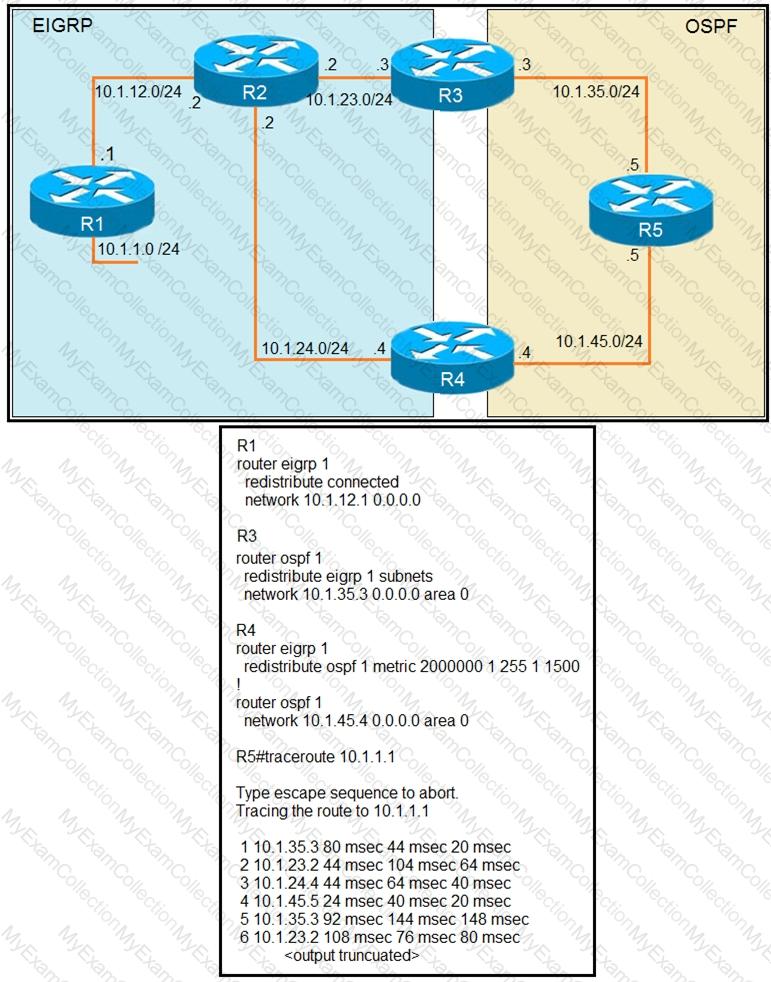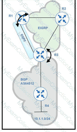 BGP and EIGRP are mutually redistributed on R3, and EIGRP and OSPF are mutually redistributed on R1. Users report packet loss and interruption of service to applications hosted onthe 10.1.1.0724 prefix. An engineer tested the link from R3 to R4 with no packet loss present but has noticed frequent routing changes on R3 when running the debug ip route command. Which action stabilizes the service?