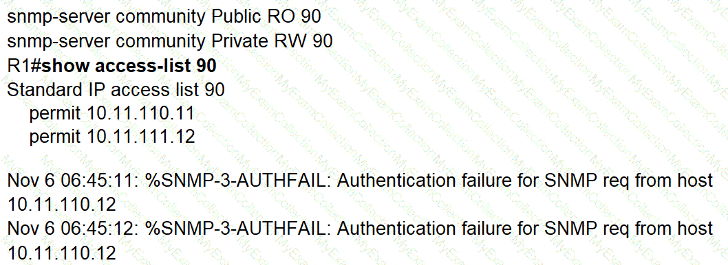 A network administrator notices these console messages from host 10.11.110.12 originating from interface E1/0. The administrator considers this an unauthorized attempt to access SNMP on R1. Which action prevents the attempts to reach R1 E1/0?