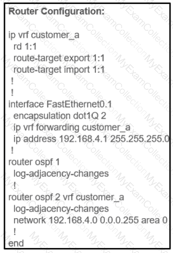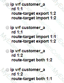 The network administrator configured VRF lite for customer A. The technician at the remote site misconfigured VRF on the router. Which configuration will resolve connectivity for both sites of customer_a?