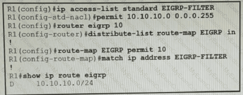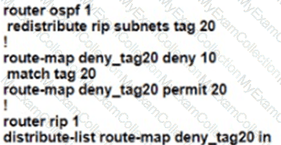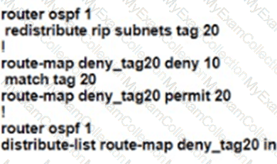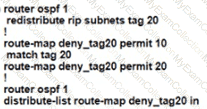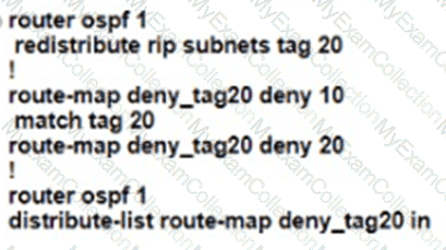 configuration that is shown. The route is still present in the routing table as an OSPF route. Which action blocks the route?