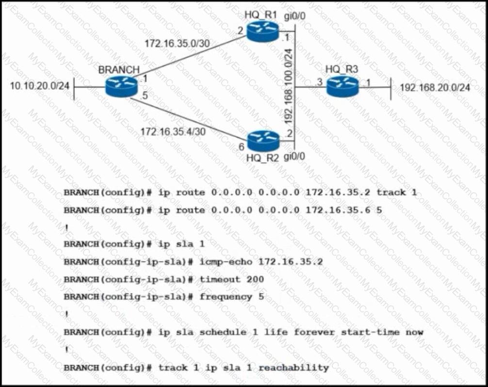 Traffic from the branch network should route through HQ R1 unless the path is unavailable. An engineer tests this functionality by shutting down interface on the BRANCH router toward HQ_R1 router but 192.168.20.0/24 is no longer reachable from the branch router. Which set of configurations resolves the issue?