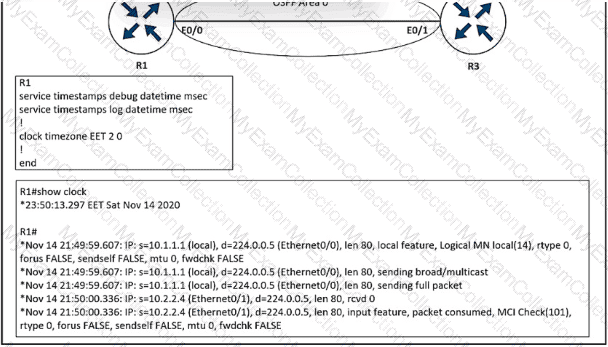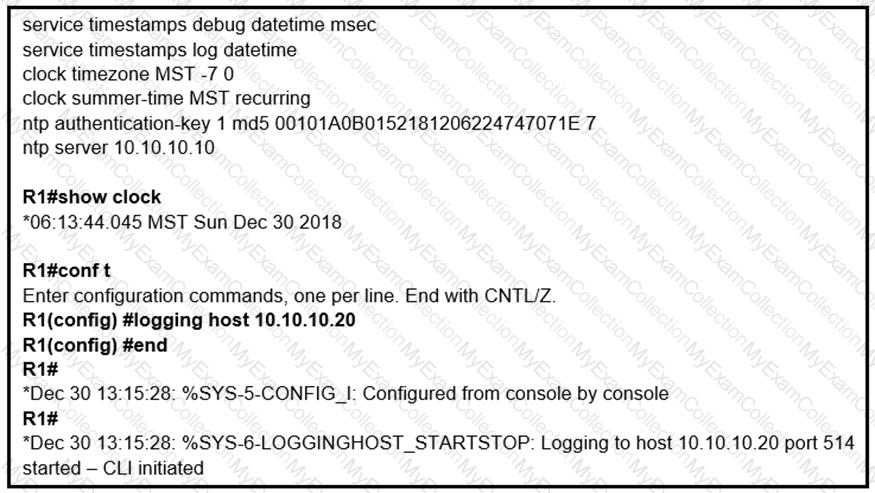 Refer to the exhibit. An engineer cannot determine the time of the problem on R1 due to a mismatch between the router local clock and legs. Which command synchronizes the time between new log entries and the local clock on R1?