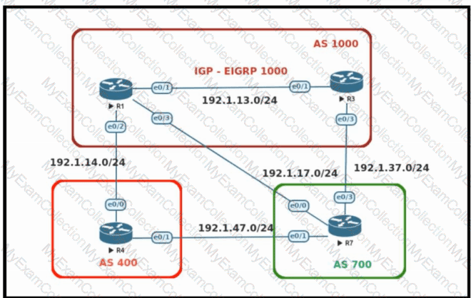 Refer to the exhibit. R1 should have BGP routes marked with an "i" (IGP origin code). Which configuration resolves the issue?