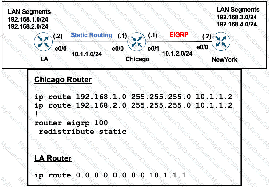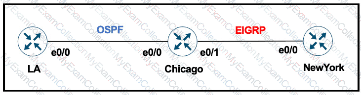 The network administrator must mutually redistribute routes at the Chicago router to the LA and NewYork routers. The configuration of the Chicago router is this: