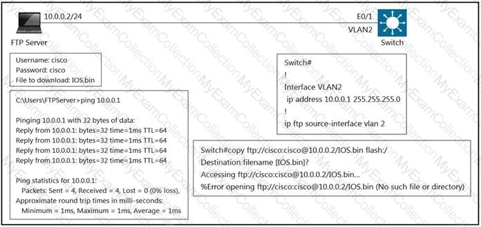 An engineer cannot copy the IOS.bin file from the FTP server to the switch.