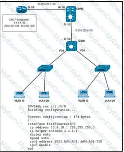 Clients on ALS2 receive IPv4 and IPv6 addresses but clients on ALS1 receive only IPv4 addresses and not IPv6 addresses. Which action on DSW1 allows clients on ALS1 to receive IPv6 addresses?