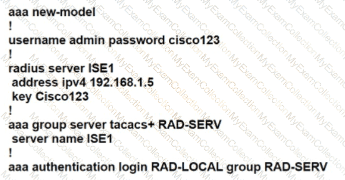 The network administrator is tasked to configure R1 to authenticate telnet connections based on Cisco ISE using RADIUS. ISE has been configured with an IP address of 192.168.1.5 and with a network device pointing towards R1 (192.168.1.1) with a shared secret password of Cisco123. If ISE is down, the administrator should be able to connect using the local database with a username and password combination of admin/cisco123.