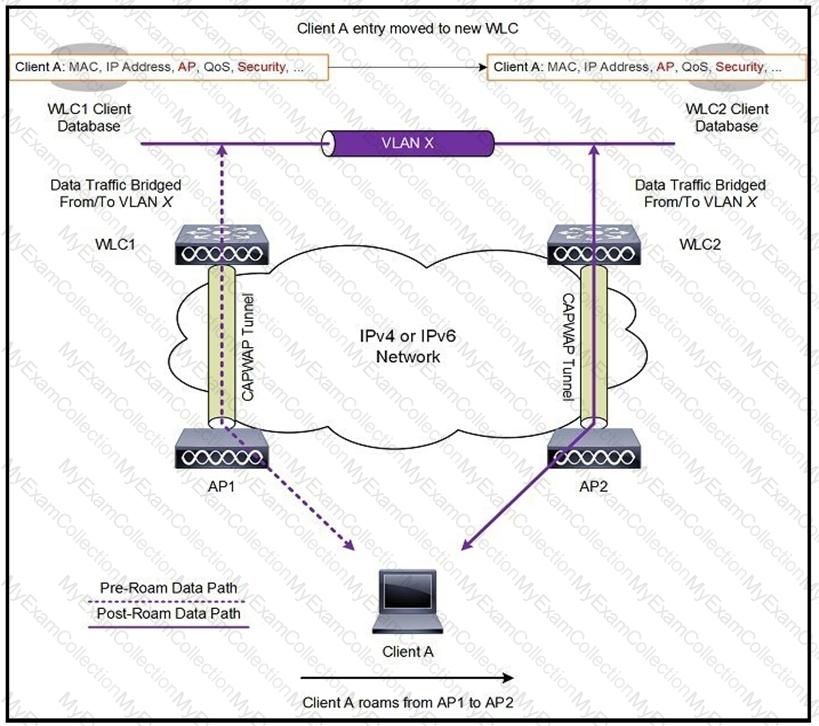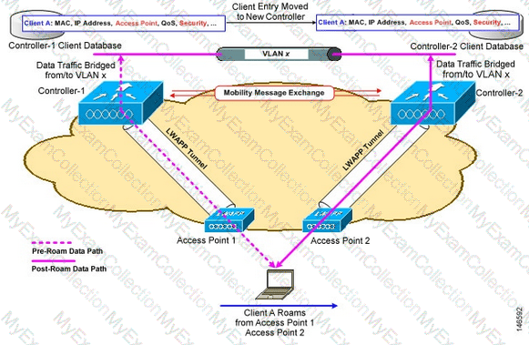 each controller has an interface in the client subnet. Both controllers are running AireOS. Which scenario explains the client roaming behavior?