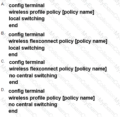 Which command set configures a Cisco Catalyst 9800 Series Wireless Controller so that the client traffic enters the network at the AP switch port?