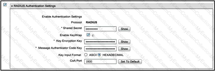 A Cisco WLC has been added to the network and Cisco ISE as a network device, but authentication is failing. Which configuration within the network device configuration should be verified?