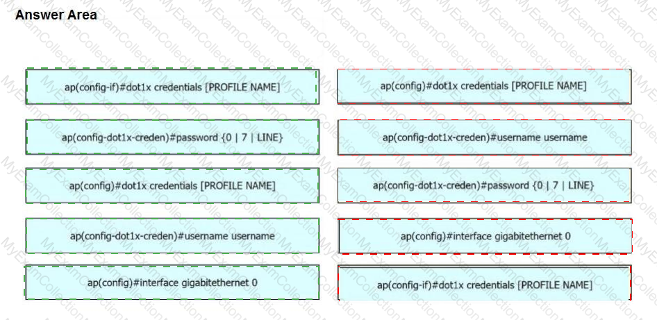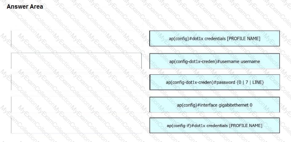 A network engineer must get an autonomous AP to authenticate to the upstream switch via IEEE 802.1 X. Drag and drop the commands from the left onto the right to complete the configuration.