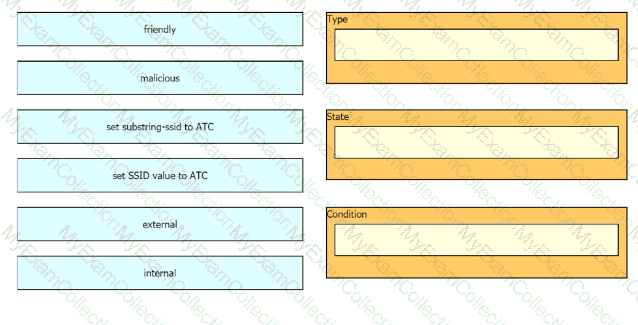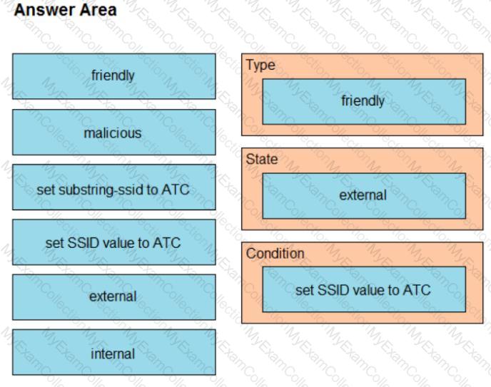 The network management team in a large shopping center has detected numerous rogue APs from local coffee shops that are broadcasting SSIDs. All of these SSIDs have names starting with ATC (for example, ATC302, ATC011, and ATC566). A wireless network engineer must appropriately classify these SSIDs using the Rogue Rules feature. Drag and drop the options from the left onto the categories in which they must be used on the right. Not all options are used.
