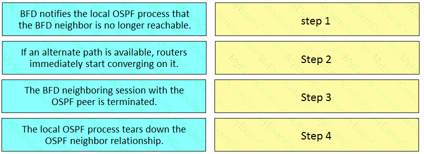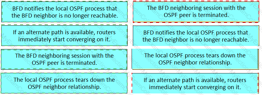 A failure occurs on the network between two BFD and OSPF neighbors. Drag and drop the protocol actions from the left into the correct order on the right.