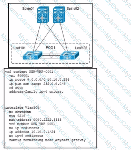 Refer to the exhibit. An engineer must deploy NEW-VRF-001 in the data center. All hosts require full reachability with all other hosts, no matter on which pod the host deployment occurs. Which set of commands must the engineer include in the deployment?