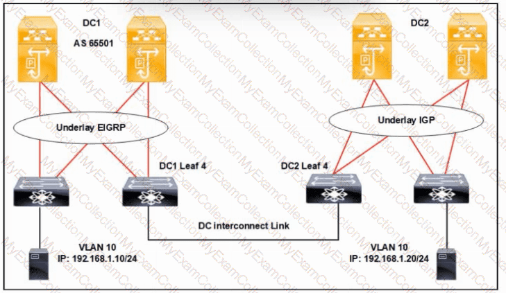 Refer to the exhibit The data center DC1 uses VXLAN technology The company asked a service provider to design another data center called DC2 and stretch EVPN information between the data centers based on the same technology The fabric requires