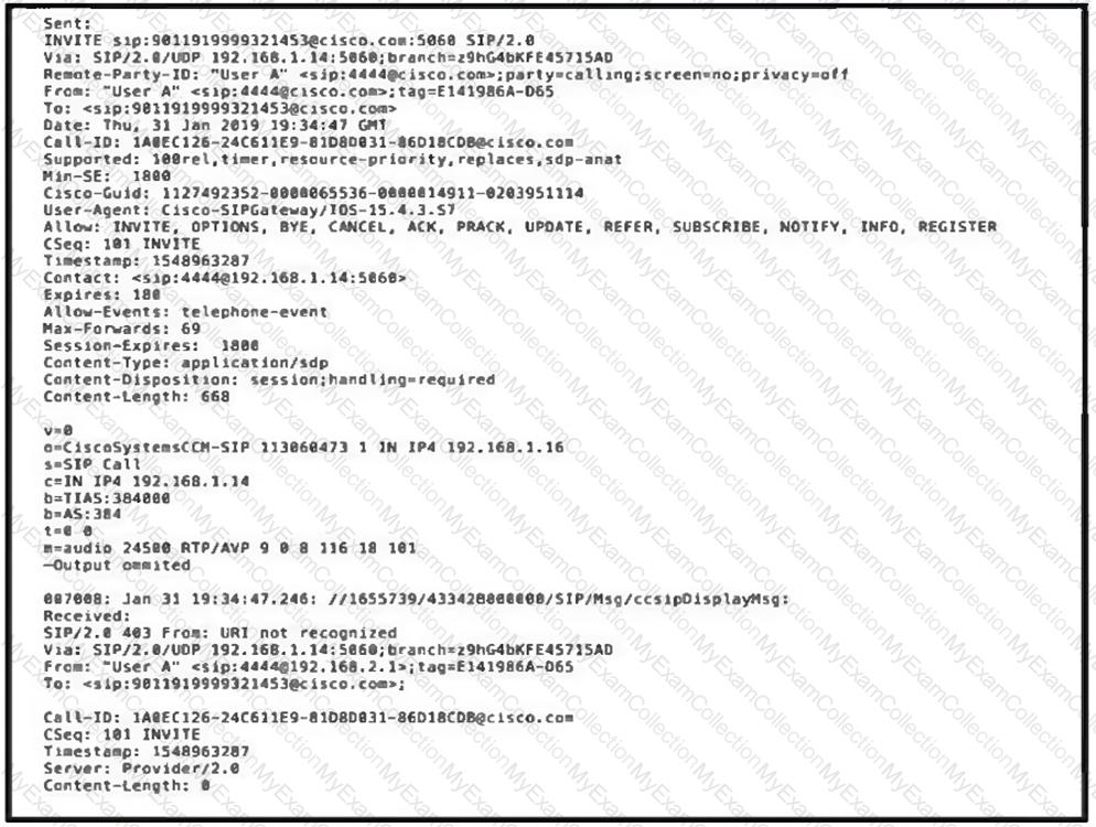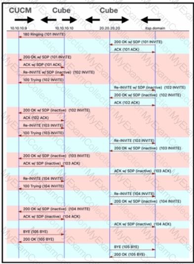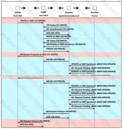 Refer to the exhibit. During a troubleshooting session, an engineer was presented with this call flow output diagram after a user reported issues with a call via the SIP ITSP to a counterpart. What is occurring with this call flow?