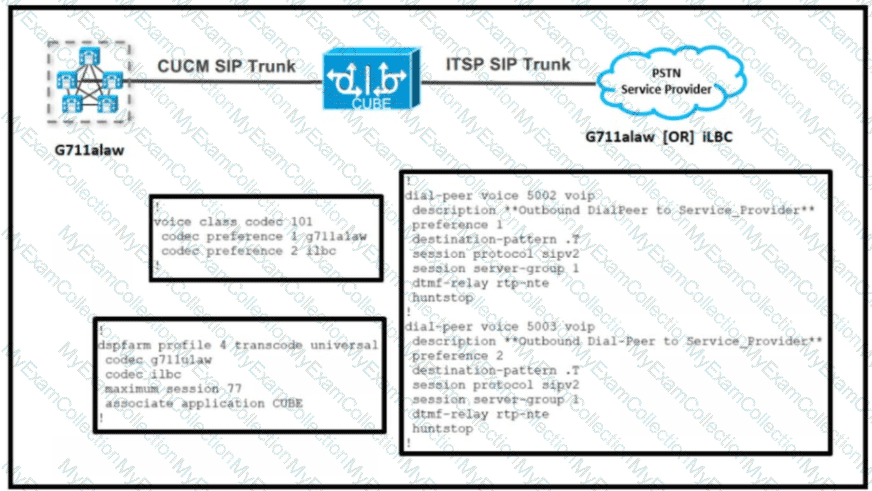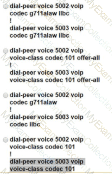 Outbound calls to the service provider cause intermittent errors due to a codec mismatch. The internal network sends early offer SDP that contains only G.711 A-law. The service provider reports that some destinations support only G.711 A-law while others support only iLBC. The service provider also allows only 20 active calls at a time Which configuration allows successful media negotiation for all calls using outbound dial peers 5002 and 5003?