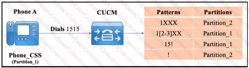 The Cisco UCM is configured with four route patterns. When phone A dials 1515, which pattern does Cisco UCM choose as the correct match?