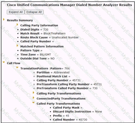 A user cannot call number 730. which Is an abbreviated number for 45730. The engineer recently configured a translation pattern In Cisco UCM. The newly configured translation pattern of 7XX prefixes the digits 45. The engineer uses DNA to troubleshoot the issue. What is the reason for this problem?