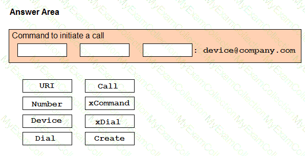 Drag and drop the elements to create the command to initiate a call to device@company.com using the Webex Devices xAPI SSH Interface. Not all options are used.