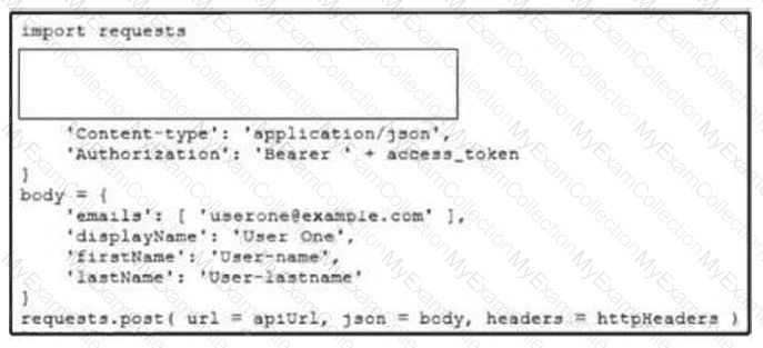 A collaboration engineer needs to create a new Webex user. Which code snippet must be placed in the blank in the code to meet