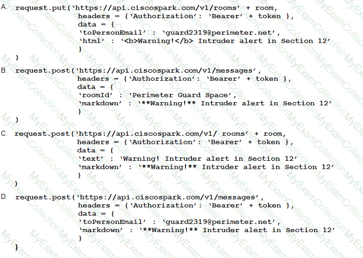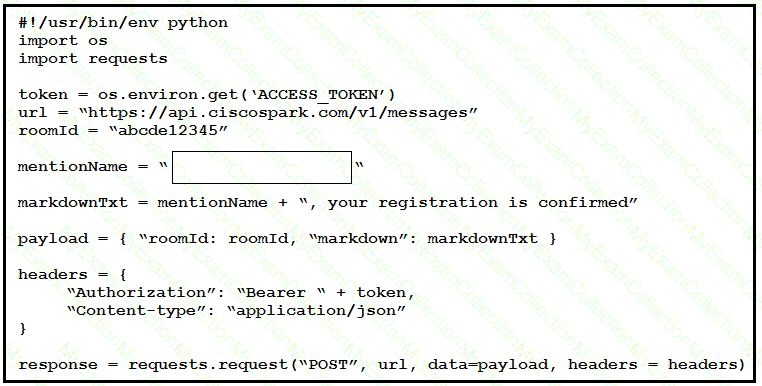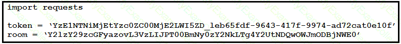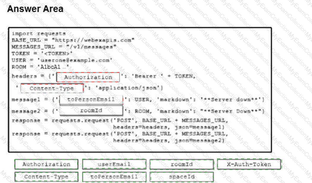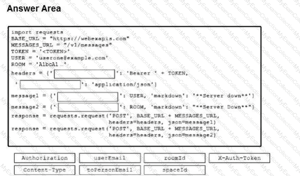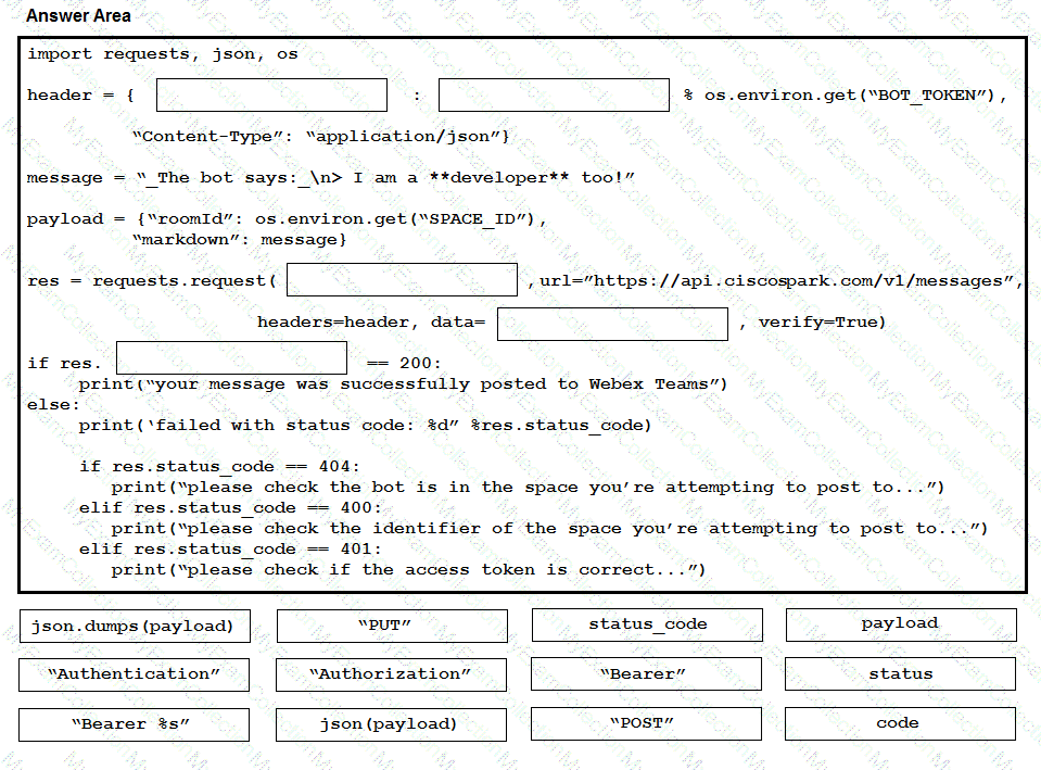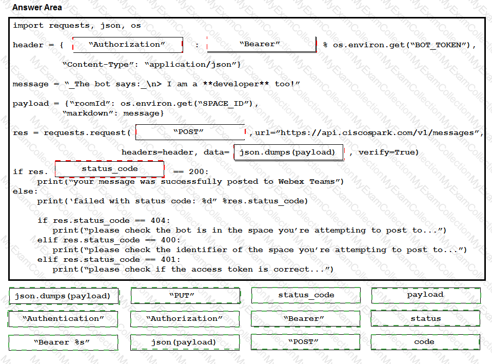 A developer has implemented ChatOps to a Webex Teams space as described in the exhibit. The Python script that pushes the notifications to the Teams space is shown. Drag and drop the code to complete the script. Not all options are used.