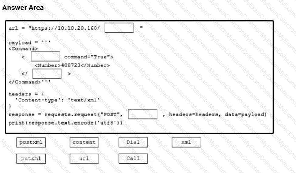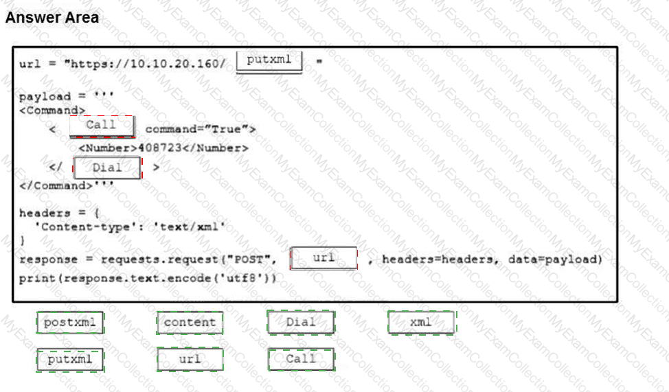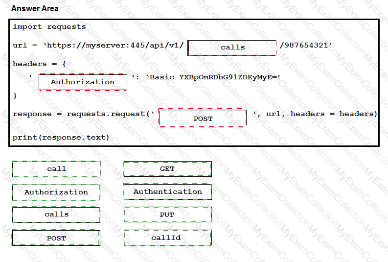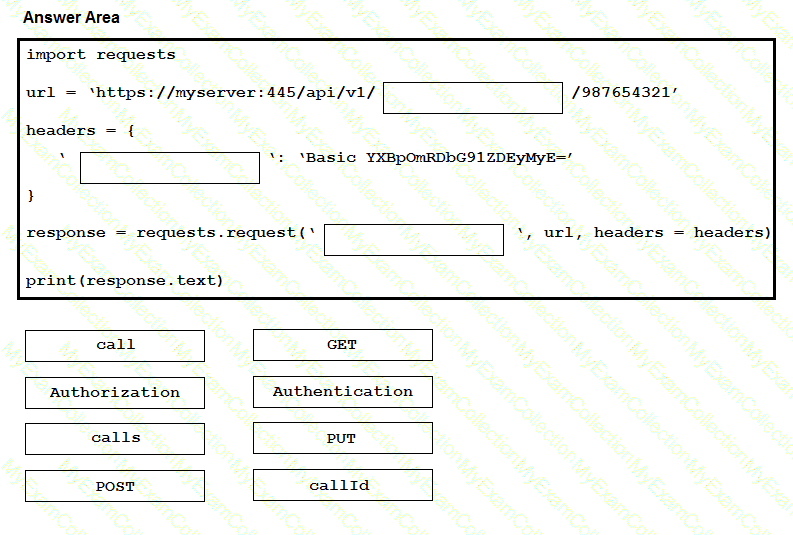 The Python script executes a REST API to retrieve information from the Cisco Meeting Server about the call with an identifier of “987654321â€. Drag and drop the code onto the snippet to complete the Python script. Not all options are used.