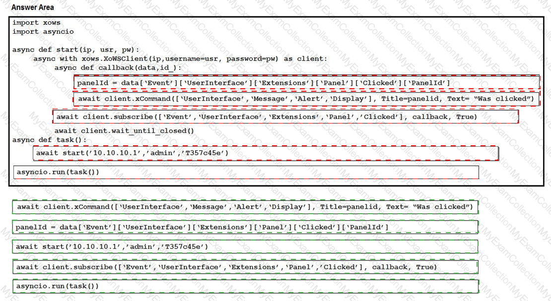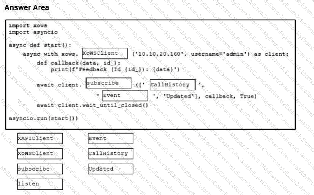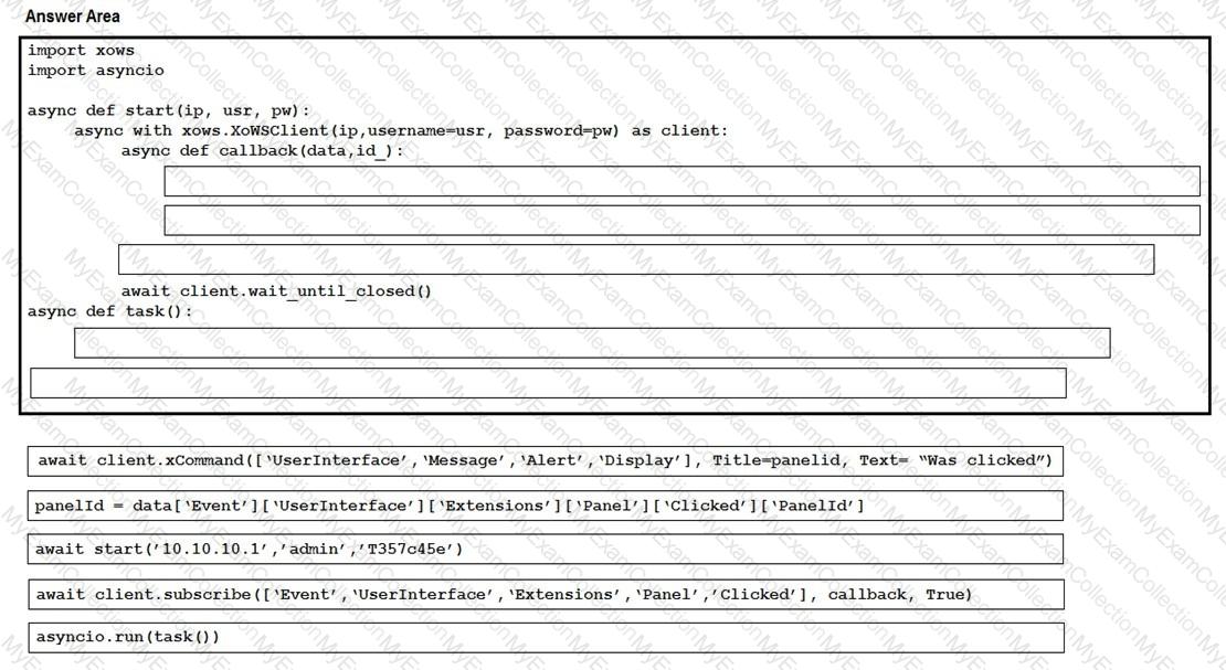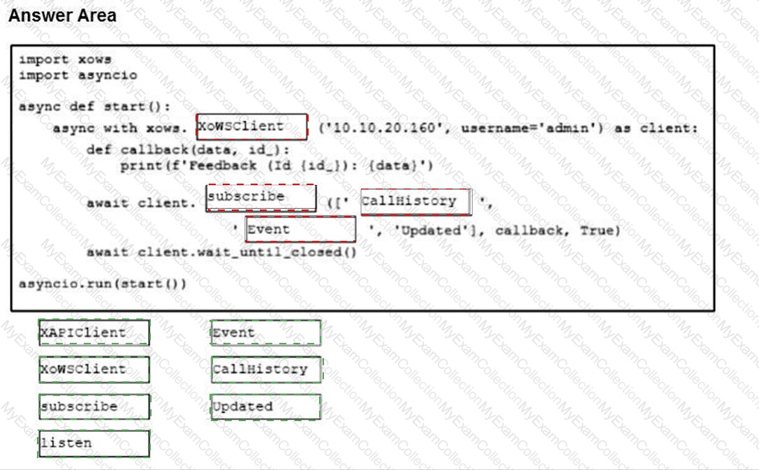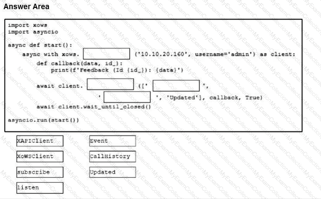 Drag and drop the code snippets from the bottom onto the boxes where the code is missing to listen for Call History events using the xAPI Python SDK.
