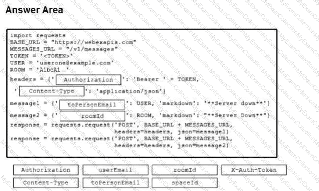 Drag and drop the code snippets from the bottom onto the blanks in the script that sends the Server Down message to User One at userone@example.com and to the CLAUTONOC space with room ID A1bcA1 by using Cisco Webex. Not all options are used.