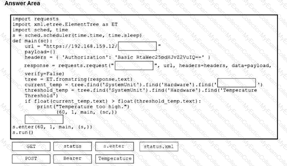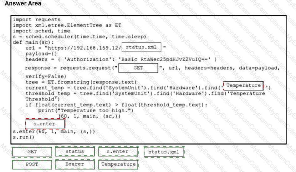 A software engineer must configure a Cisco TelePresence device and custom reporting dashboard to retrieve and display the temperature of the device every minute. Drag and drop the code snippets from the bottom onto the boxes in the code to collect and send the data by using the xAPI. Not all options are used.