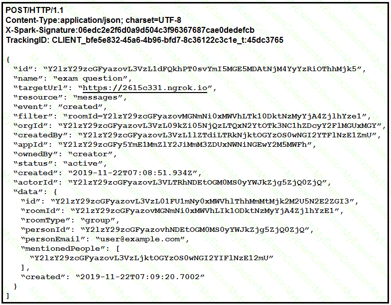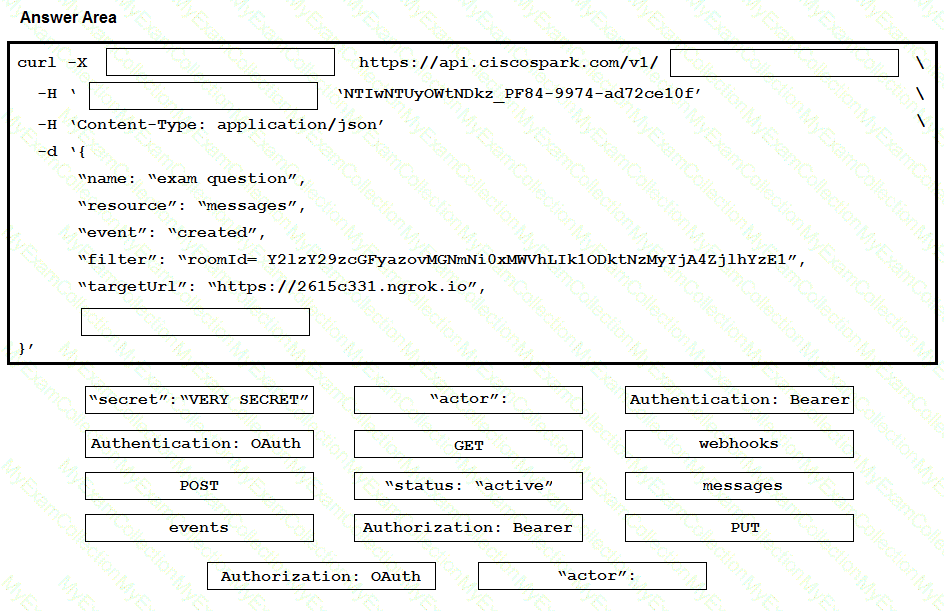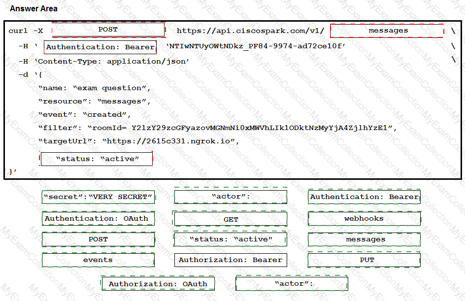 A bot is receiving notifications such as the one displayed in the exhibit. Drag and drop the code onto the snippet to complete the API request that was sent to Webex Teams so that the bot will receive these notifications. Not all options are used.