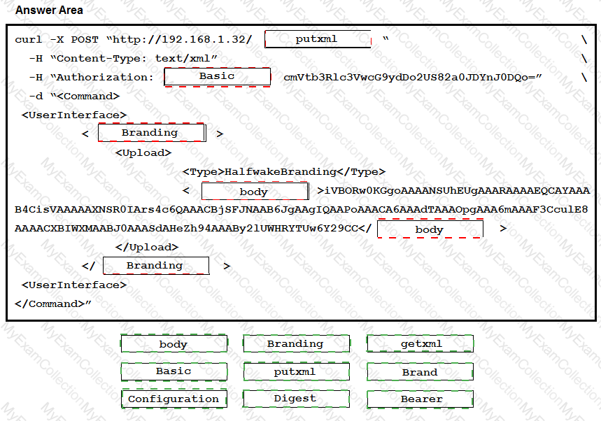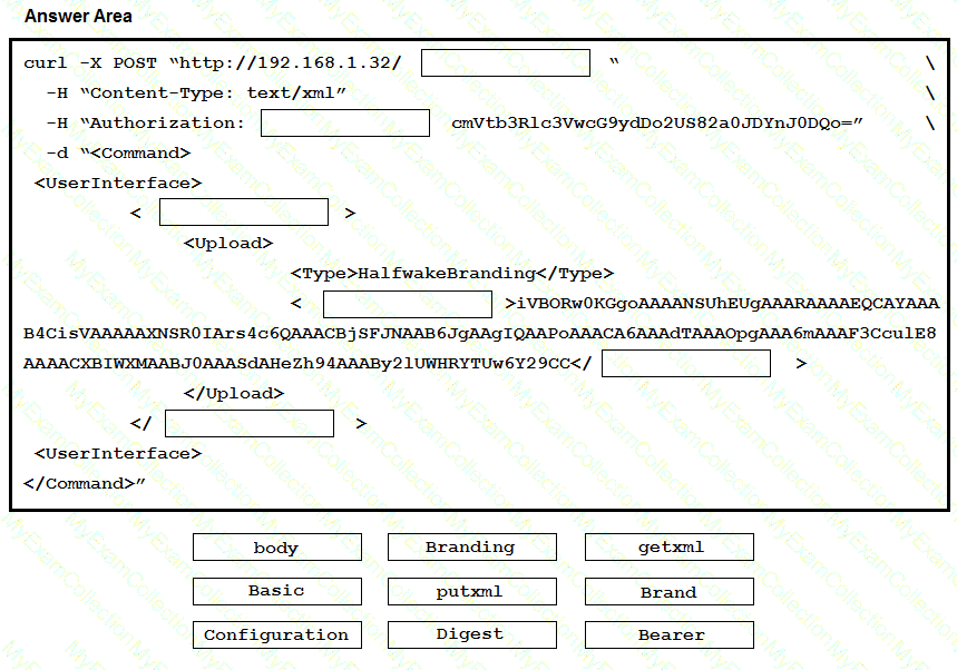 Drag and drop the code to complete the curl command that creates a halfwake brand logo using the xAPI HTTP API. Not all options are used. Code can be used more than one time.