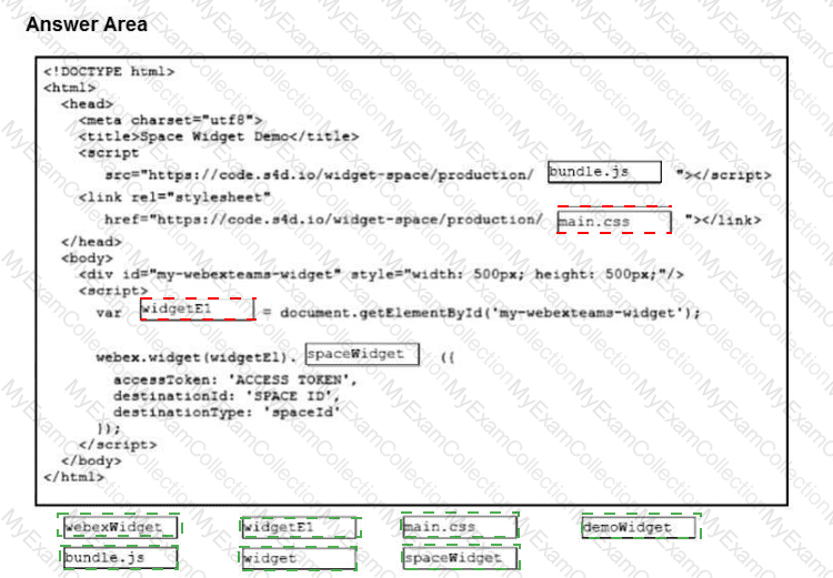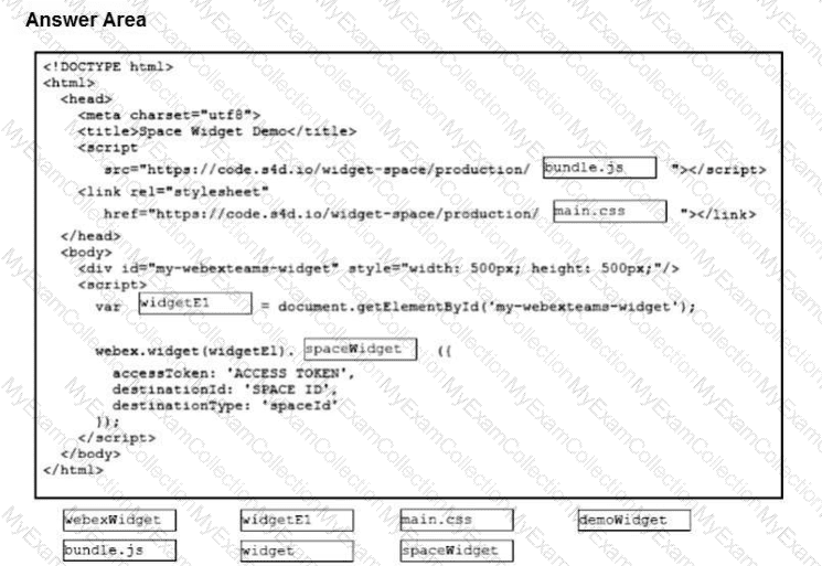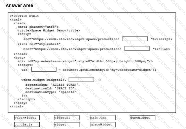 Adeveloper embeds the Cisco Webex widget inside an HTML web page. Drag and drop the code snippets from the bottom onto the blanks in the code