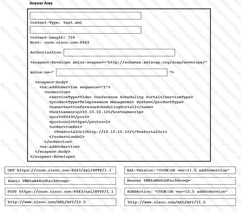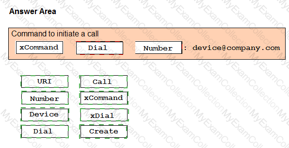An administrator must test a Cisco collaboration room device. Drag and drop the code snippets from the bottom onto the blanks in the code to perform a test call using the xAPI. Some options may be used more than once. Not all options are used.