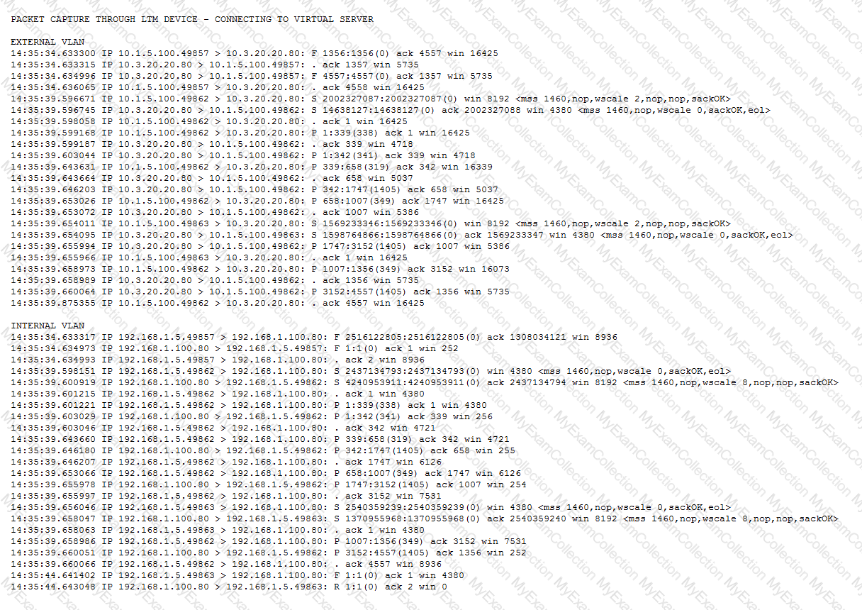 An LTM Specialist configured a virtual server to load balance a custom application. The application works when it is tested from within the firewall but it fails when tested externally. The pool member address is 192.168.200.10:80. A capture from an external client shows: