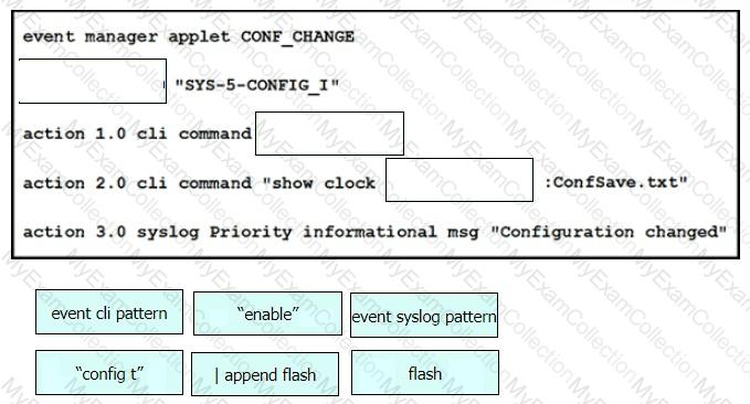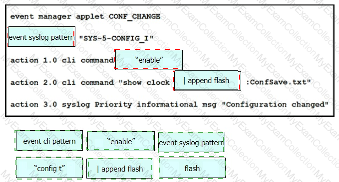 Drag and drop the snippets onto the blanks within the code to create an EEM script that adds an entry to a locally stored text file with a timestamp when a configuration change is made. Not all options are used.