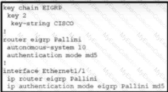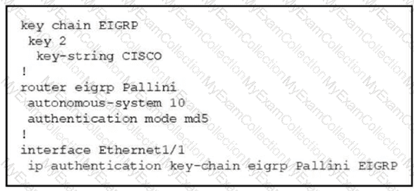 Two Cisco Nexus Series Switches use EIGRP between their Eth1/1 interfaces. The switches are configured to support EIGRP authentication. Which set of CLI