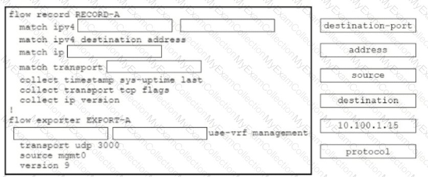 Drag and drop the code snippets from the right onto the blanks in the code to complete the NetFlow configuration.