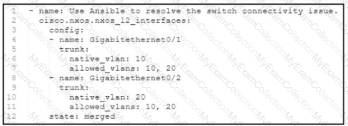 Refer to the exhibit An engineer must resolve a connectivity issue on a Cisco 9000 Senes Switch that was configured by using Ansible The switch must be configured to meet these requirements •Interface G*gabitethemet0/1 must be a member of VLAN 10 in access mode •Interface G*gabetethernet0/2 must allow VLANs 10 and 20 in trunk mode, with native VLAN 20