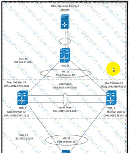 Refer to the exhibit. A Cisco data center environment is implemented with vPC. The web server replies using the SVI MAC address as the Layer 2 header instead of the HSRP MAC address on VLAN 23. This behavior causes packet drops on the Cisco Nexus 9000 Series Switches due to the vPC loop prevention mechanism The requirement is for the vPC feature to allow N9K_1 and N9K_2 to forward traffic between the NAS server and the web server, even if the HSRP's MAC address is not used on Layer 2 headers for VLAN 23. Which feature must be used to accomplish this goal?