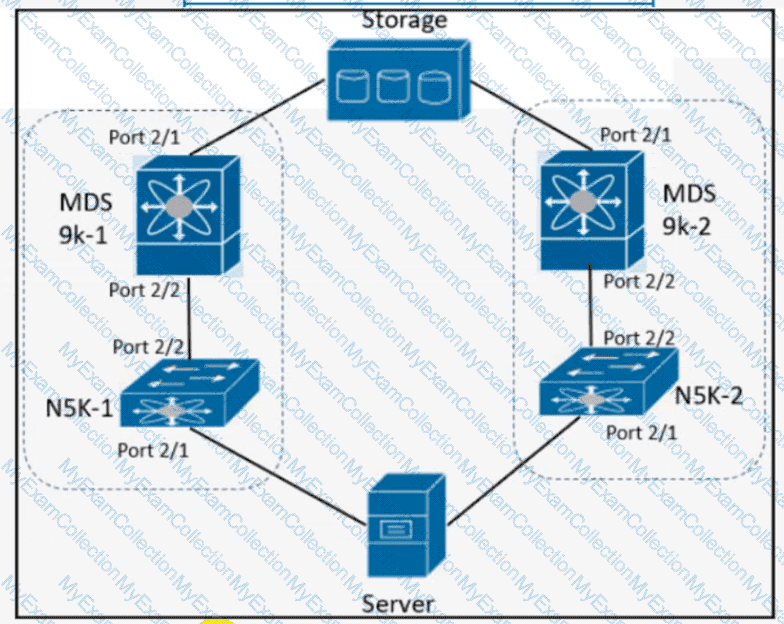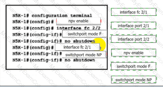 The server is sending traffic to the storage server using Fiber Channel protocol. The requirement is for the N5K-1 to forward traffic to MDS9k-1. Drag and drop the configuration steps from the right to complete the configuration for N5K-1 on the left. Not all configuration steps are used.