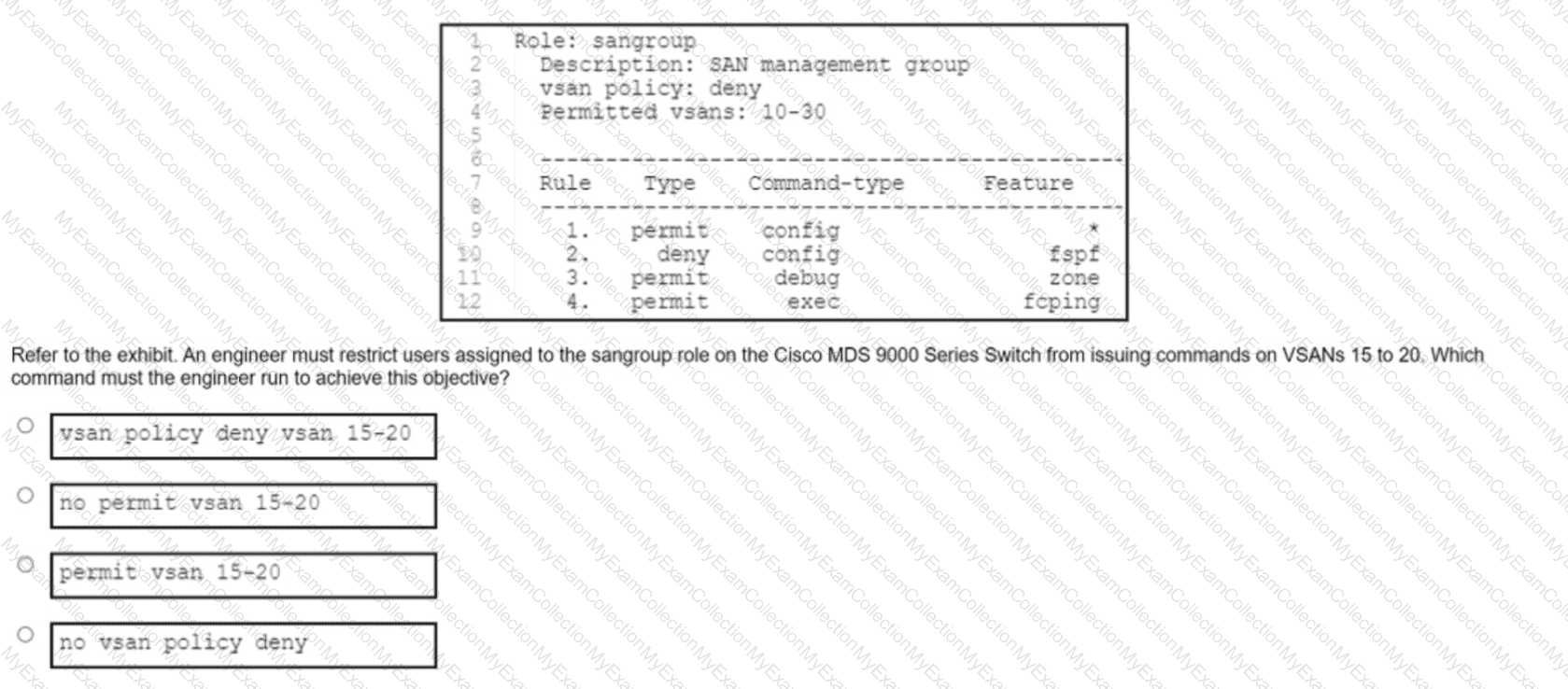 Refer to the exhibit An engineer must restrict users assigned to the sangroup role on the Cisco MDS 9000 Series Switch from issuing commands