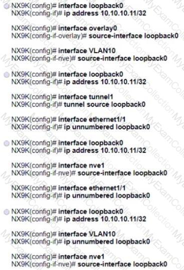 An engineer must perform an initial configuration of VXLAN Tunnel End-Point functionality on the Cisco Nexus 9000 Series platform All the necessary features are already enabled on the switch Which configuration set must be used to accomplish this goal?