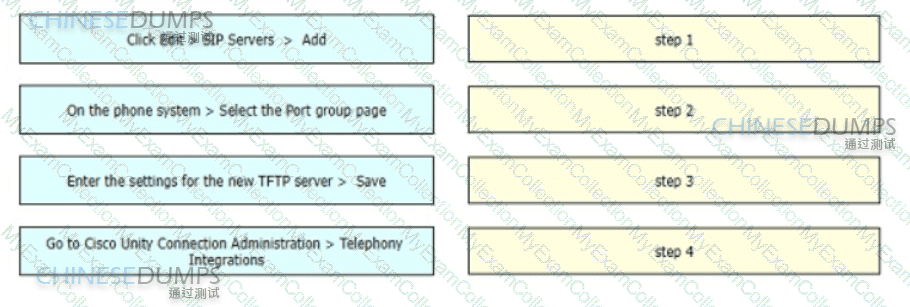 An engineer is working on a SIP integration between Cisco UCM and Cisco Unity Connection and must add an additional TFTP server Drag and drop the configuration steps from the left into the correct order on the right.